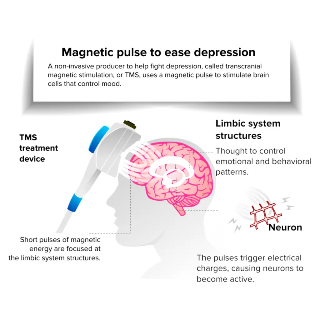 TMS delivers focused magnetic pulses through a small coil placed against the scalp. These pulses activate specific brain regions associated with emotional and cognitive functioning: